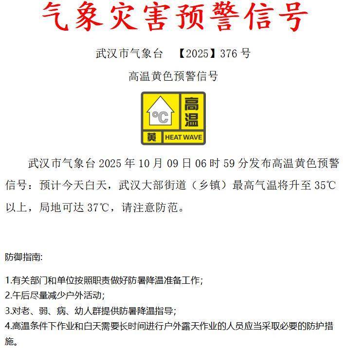 湖北日报讯(记者唐薇薇、通讯员陈胜超)9日6时59分,武汉市气象台发布高温黄色预警信号:预计今天白天,武汉市大部分街道(镇)最高气温将升至35度以上,局地气温预计将达到37度。请采取预防措施。预计今天下午至晚上,武汉局地有对流天气。昨天武汉多云转晴,但江夏东南部午后至深夜出现雷阵雨,累计降雨量不足3毫米。昨天多地最低气温20至23℃,最高气温33至36℃。今早多云转晴,市中心最低气温 25-28°C,其他大部分地区最低气温 23-25°C。 12日至13日,武汉出现冷空气活动,偏北风较强,气温较低。伊拉从13日到14日,形势严峻。 16日开始,在高原低谷和地面冷空气共同影响下,全市出现降水降温过程。具体预测如下。 10月9日:晴转多云,下午和晚上有零星阵雨或雷阵雨,风向由东风2级转为偏北风3级,气温22~35℃。 10月10日:晴转多云,分散阵雨或雷阵雨,北风3级,气温20~34℃。10月11日:晴转多云,北风3级,气温20~32℃。 10月12日:多云,北风3级至3级至4级,阵风5级,气温18至33℃。 10月13日:多云间雨,北风3~4级,阵风5级,气温17~26℃。 10月4日 多云间雨,北风2-3级,气温17-25℃。 10月15日:多云,北风2至3级,气温19至28摄氏度。 10 月 16 日:阴天到小到中雨,北风2~3级~3~4级,阵风5~6级,气温22~29摄氏度。